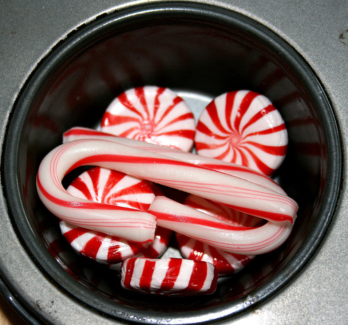 Put dark chocolate in a microwave bowl and heat on high setting in microwave 2 to 3 minutes or until chocolate is melted and smooth. Stir chocolate about every 30 seconds to make sure lumps are melting. Put white chocolate in microwave bowl and heat like dark chocolate. Put candy canes in a large freezer bag. Using a rolling pin break the candy canes into different size pieces. Place half the crushed candy canes in a strainer and shake small crumbs into dark chocolate. Place the remaining crushed candy into strainer and shake crumbs into white chocolate. Line a 9X9X9 baking pan with heavy aluminum foil. Spread dark chocolate out into bottom of pan. Spread white chocolate over the dark chocolate in pan. Sprinkle the rest of the crushed candy canes over the top. Cover and refrigerate for about 2 hours. When hardened break up pieces of candy by dropping straight down on the counter.